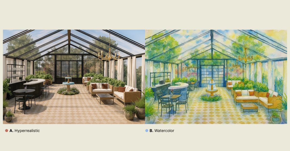 Hyperrealistic works well to show details, but using AI rendering can lead to small changes that may not accurately reflect the design. Watercolor hides the inaccuracies and really illustrates the ‘feeling’ of the space, but lacks information that our clients like to see.