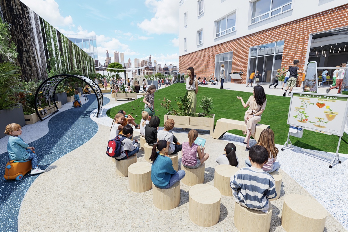 We were challenged with a 3-foot grade change between the play yard and the school entrance. Instead of treating it as a barrier or just using standard stairs and ramps we turned it into a sloped play lawn with climbing grips and a slide.